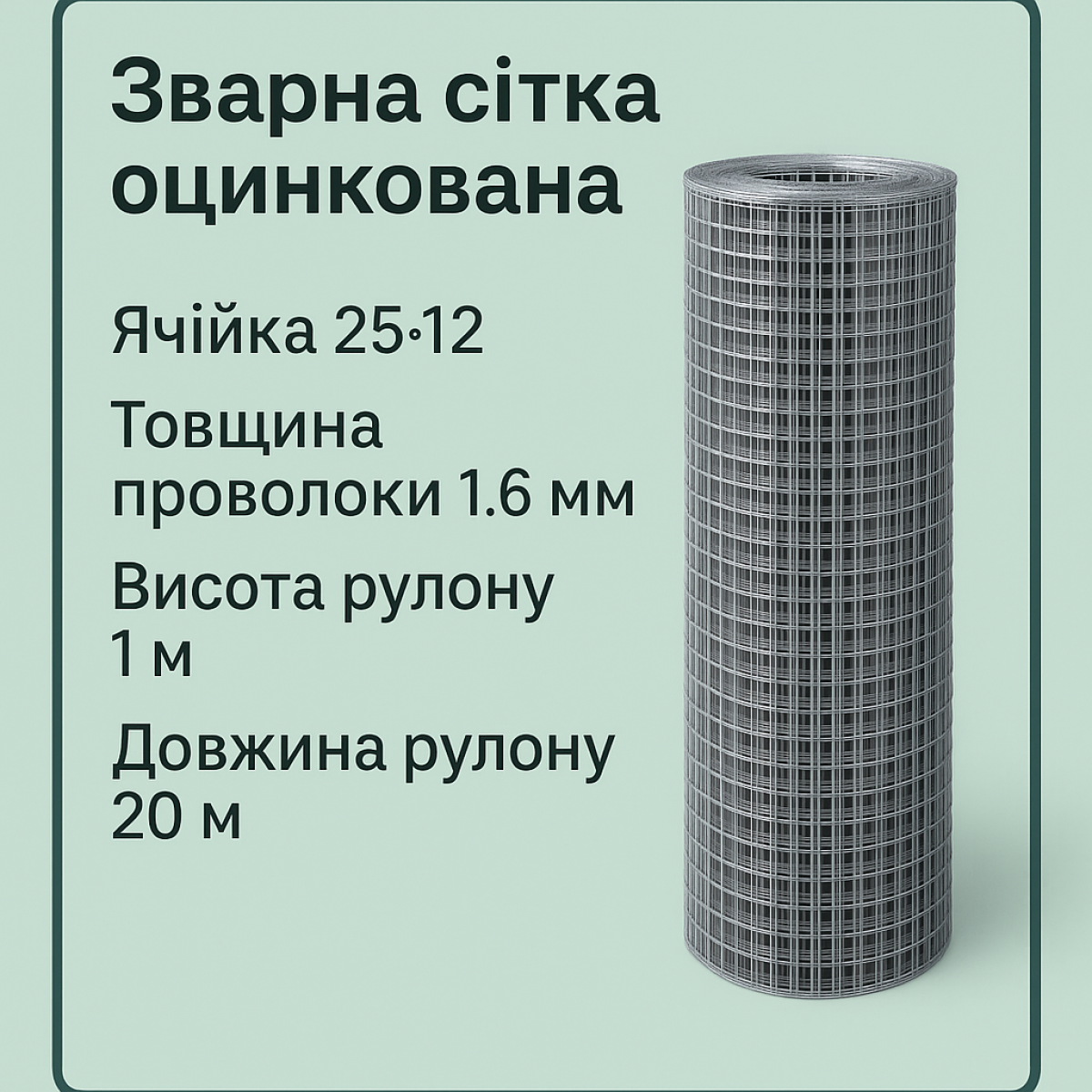 Зварна оцинкована сітка з розміром комірки 25×12 мм та діаметром дроту 1.6 мм – це міцний і довговічний матеріал для будівельних, господарських та побутових потреб. Виготовлена з оцинкованого дроту, що забезпечує високу стійкість до корозії та тривалий термін експлуатації навіть у зовнішніх умовах.